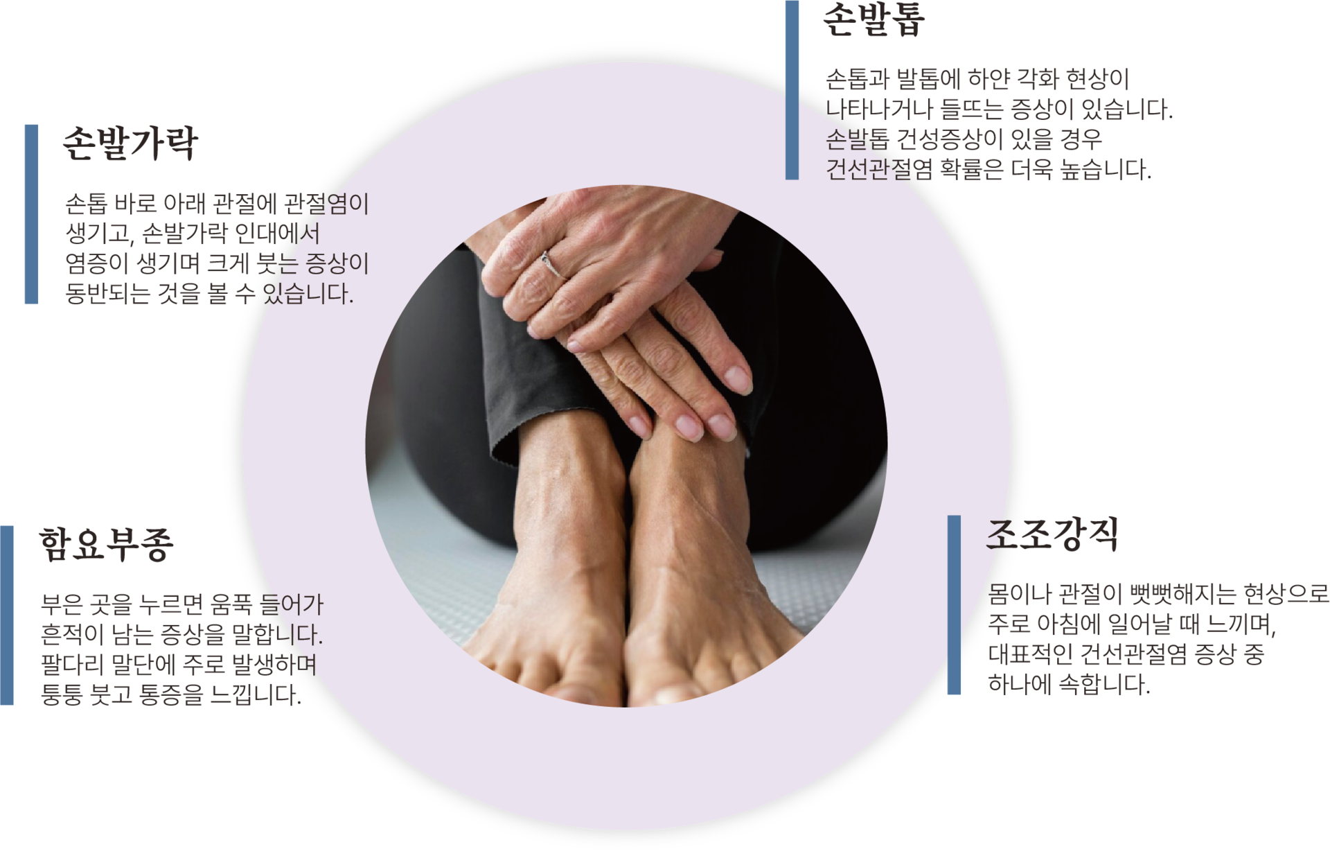· 관절통(무릎, 발목, 발) · 발뒤꿈치 통증(heel pain) · 발목 뒤가 붓고 통증 · 손발가락 줏기 · 허리, 엉덩이 통증 |